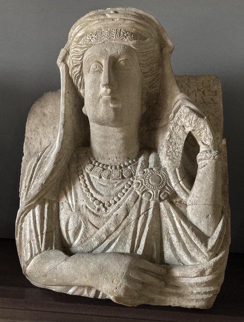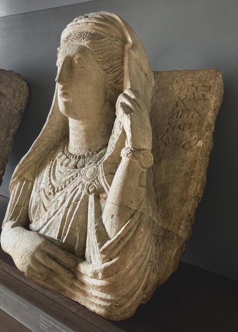- Rahmenlose Platte mit Halbfigur einer Frau in Ärmelgewand und Mantel mit großer Scheibenfibel, Armreif, Halsketten, Stirnband und Schleier. Seitlich des Kopfes Inschrift.