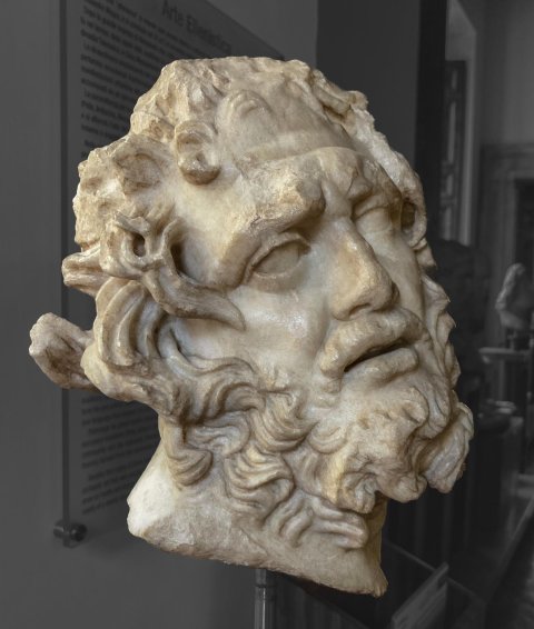 - Kopf eines alten Kentauren mit zurückgebeugtem Kopf. Teil einer Gruppe mit einem jugendlichen heiteren und einem alten leidenden Kentauren, beide von einem Eroten vorwärtsgetrieben.