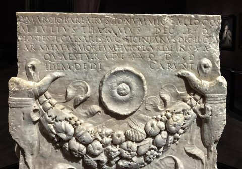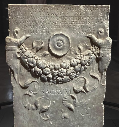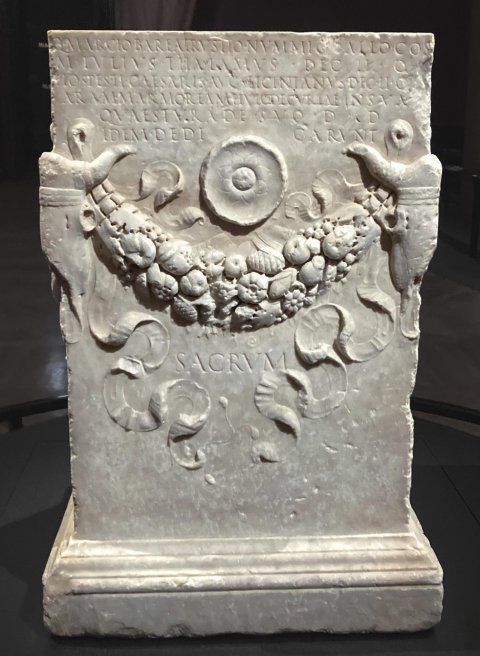 Q(uinto) Marcio Barea T(ito) Rustio Nummio G̲allo co(n)s(ulibus) / M(arcus) Iulius Thalamus dec(urio) II q(uaestor) II / Hospes Ti(berii) Caesaris Aug(usti) 〈servus〉 Licinianus dec(urio) II q(uaestor) II / aram marmoream huic decuriae in sua / quaestura de suo d(ono) d(ederunt) / idem dedicarunt // sacrum //
