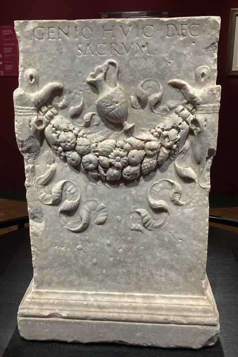 - Auf allen vier Seiten an Bukranien hängende Girlande mit Tänien und darüber Inschrift; in den Girlandenbögen Opfergeräte (vorn Schale, rechts Kanne, links Schöpfer, auf der Rückseite Opfermesser).