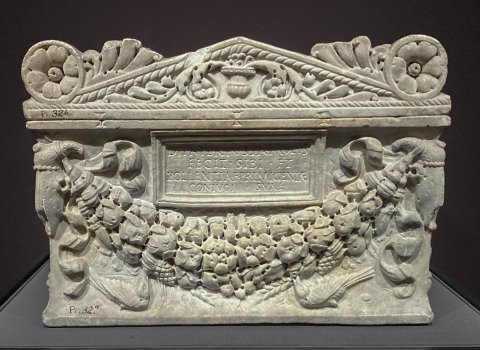 Auf der Kastenvorderseite gerahmtes Schriftfeld über an Bukranien hängender Girlande mit Vögeln. Auf den Schmalseiten gekreuzte zusammengebundene Efeuzweige, an den hinteren Ecken Fackel. - Inschrift