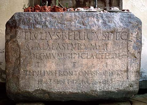- T(itus) Iulius Bellicus dec(urio) / alae Asturum II / dec(urio) municipi(i) Cla(udiae) Celeiae / t(estamento) f(ieri) i(ussit) / Ti(berius) Iulius Fontonis f(ilius) Civis / frater et heres fecit