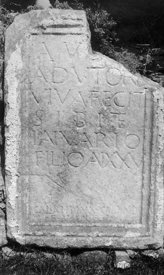 - Aus[ca] / Adiutoris (filia) / viva fecit / sibi et / Ianuario / filio an(norum) XXV / Calandina Calandi/ni f(ilia) an(norum) LX o(bita)