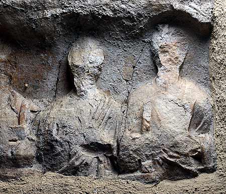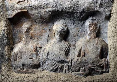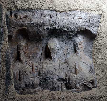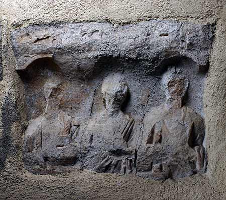 - Familie: in tiefer Nische mit drei Bögen drei Brustbilder. Links Mann im Sagum, in der Linken Schreibtafel. In der Mitte Frau. Rechts Mann in Ärmeltunica und Sagum. Auf der oberen Rahmenleiste Fries mit Tieren.