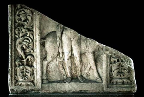 Linke Nebenseite eines Grabmals. Mythische Figur: vor einem Pferd stehender nackter Dioskur, im rechten Arm Speer. Seitlich zwei schmale Felder mit Akanthusranken.
