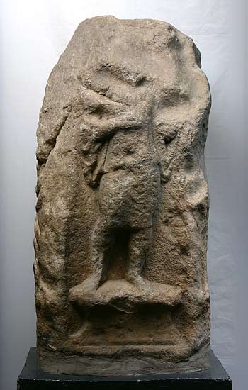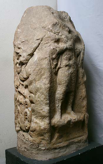 - Eckblock: auf der Vorderseite Diener (Librarius - Scriba ?): auf niedrigem Podest Mann in kurzer Tunica mit weiten Ärmeln, in der Rechten Etui für Schreibzeug ? Auf der linken Nebenseite Rahmenfeld mit Akanthuskelch und Ranke.