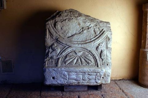 - Gewölbte Platte zwischen Balken mit Soffitte. Zentrales Medaillon zwischen zwei Halbkreisen mit Muschel. Relief des Medaillons zerstört. In den Zwickeln Delphine. Soffitte mit zwei Blattkelchen. Bogenförmige Stirnseite profiliert.
