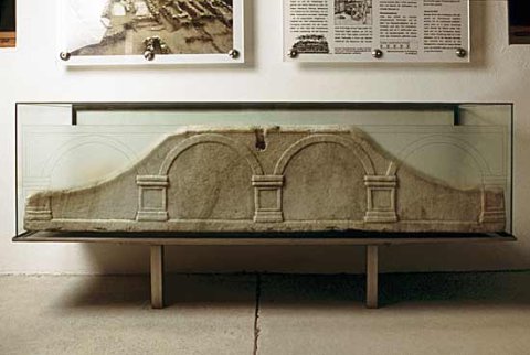 - Auf der Vorderseite des Sarkophagkastens vier Arkaden auf niedrigen Pfeilern.