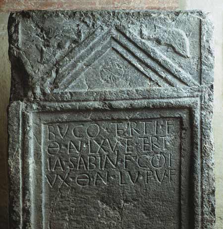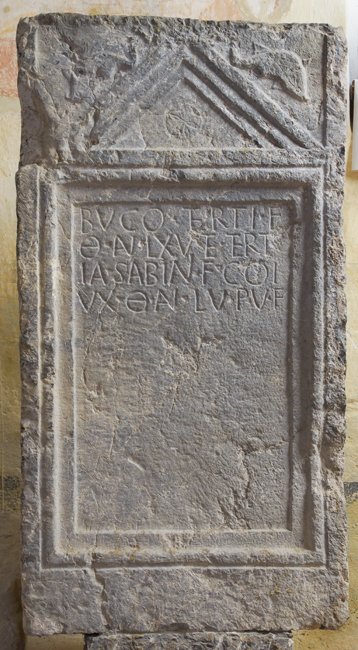 - Buco Terti f(ilius) / o(bitus) an(norum) LXV et Tert/ia Sabini f(ilia) co(n)i/ux o(bita) an(norum) LV p() v(ivi) f(ecerunt)
