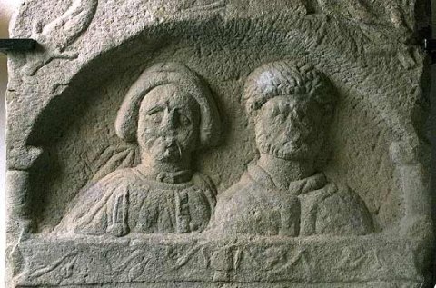 - Unter Bogen auf Säulen zwei Büsten (Ehepaar). Links einheimische Frau: Haube, Fibeln. Rechts Mann: bärtig, Locken, Paenula, Halstuch. Über dem Bogen Gorgoneion zwischen Delphinen. Zwischenfries mit Ranke. Schriftfeld zwischen Säulen.