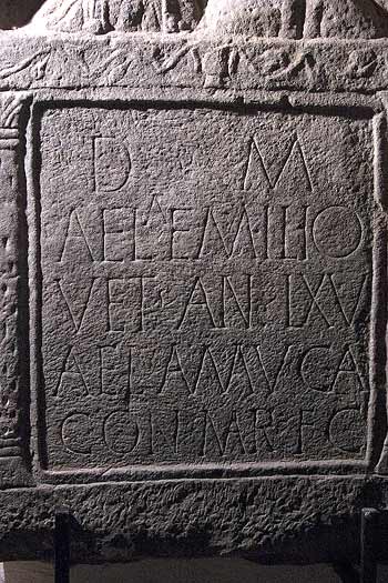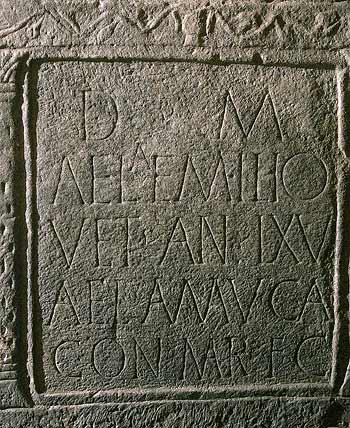 - D(is) M(anibus) / Ael(io) Aemilio / vet(erano) an(norum) LXV / Ael(ia) Amuca / con(iunx) mar(ito) f(aciendum) c(uravit)