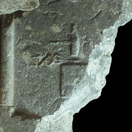 Im Sockelbild Werkzeug: Hammer, Zange mit Nagel. - Inschrift