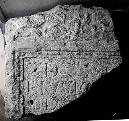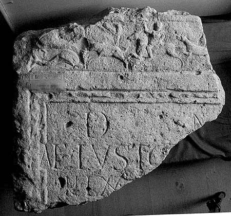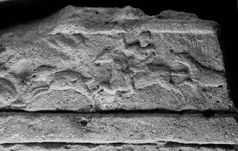 Im Zwischenfries Jagdszene: Reiter im Galopp mit erhobenem Speer, hinter ihm Hund, vor ihm Wild und Baum. Am linken Rand zwei Delphine. Früher am rechten Rand noch ein Baum und zwei Delphine erhalten. - Inschrift