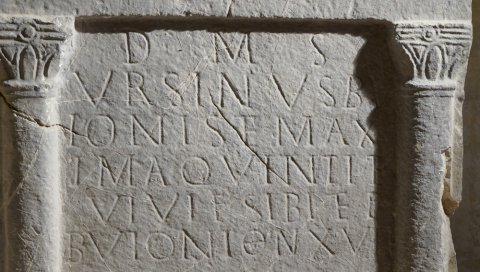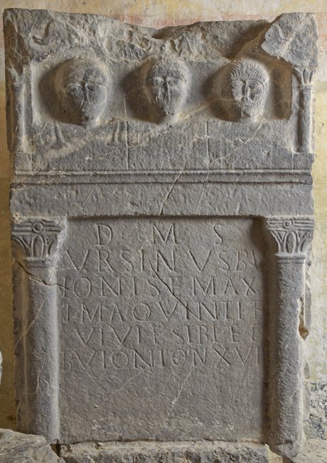- D(is) M(anibus) s(acrum) / Ursinus Bu/ionis et Max/ima Quinti <f=ET>(ilia) / vivi f(ecerunt) sibi et f(ilio) / Buioni o(bito) an(norum) XVII