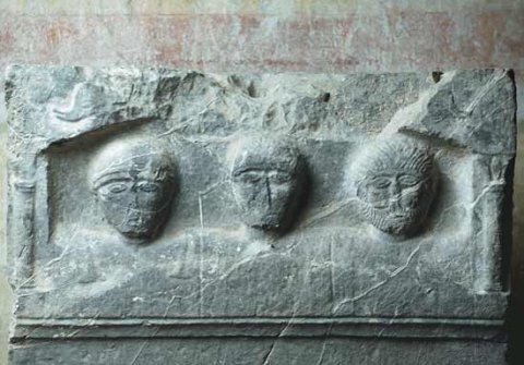 Im Hauptbild Familie: unter flachem Bogen auf Säulchen drei Büsten. Links einheimische Frau mit Haube. In der Mitte Mann: bartlos, lange Stirnfransen. Rechts Mann: bärtig, lange Stirnfransen. Über dem Bogen rechts und links Delphin.