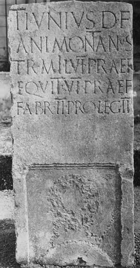 - T(itus) Iunius D(ecimi) f(ilius) / Ani(ensis) Montanus / tr(ibunus) mil(itum) VI praef(ectus) / equit(um) VI praef(ectus) fabr(um) II pro leg(ato) II