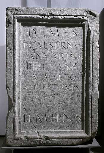 - D(is) M(anibus) s(acrum) / T(itus) Caesernius / T(iti) l(ibertus) / Ianuarius / IIIIII vir / viv(us) fec(it) / sibi et suis / h(oc) m(onumentum) h(eredem) n(on) s(equitur)