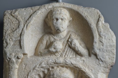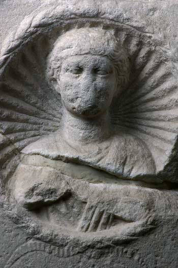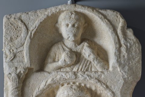 Oben im Schriftfeld zwischen kannelierten Pilastern Kranz mit Clipeus, Tänien und Muschelhintergrund, darin Brustbild eines Kindes (Mädchen): Tunica, Mantel, Halsband, in den Händen (?). - Inschrift