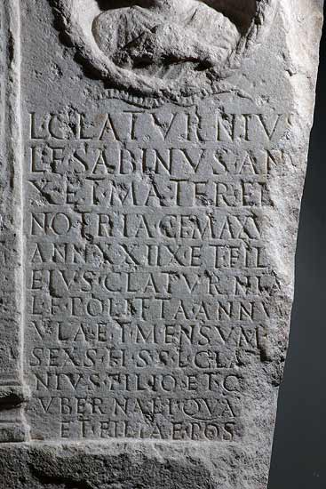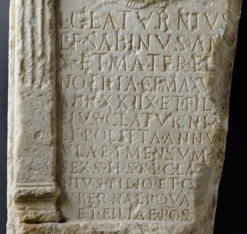 - L(ucius) Claturnius / L(uci) f(ilius) Sabinus an[n(orum)] / X et mater ei[us] / Notria C(ai) f(ilia) Maxu[ma] / ann(orum) XXIIX et fili[a] / eius Claturnia / L(uci) f(ilia) Politta annu[c]/ula et mensum / sexs h(ic) s(iti) s(unt) L(ucius) Clat[ur]/nius filio et co[nt]/ubernali quam / et filiae pos(uit)