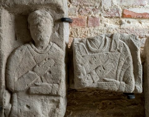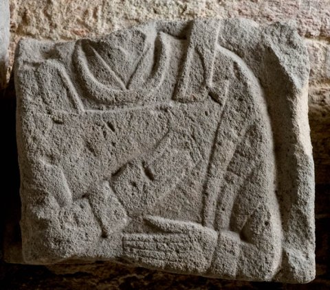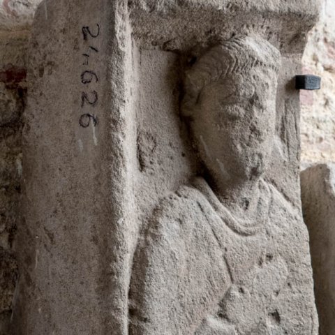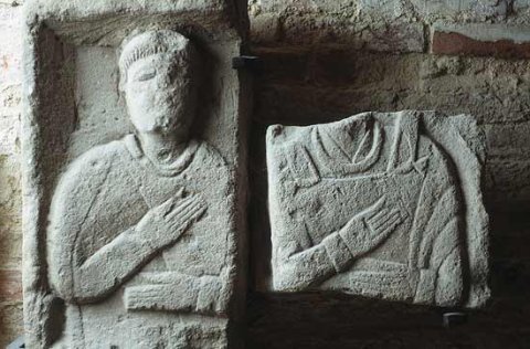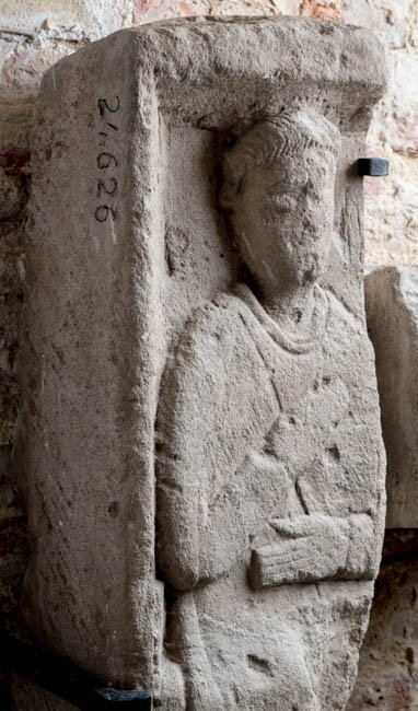 - Ehepaar: in Rechtecknische sitzende Ganzfiguren. Links Mann: bartlos, Ärmelgewand, Umhang, Halstuch. Rechts einheimische Frau: Unter- und Obergewand, Flügelfibeln, Umhang, Armreifen,Torques.
