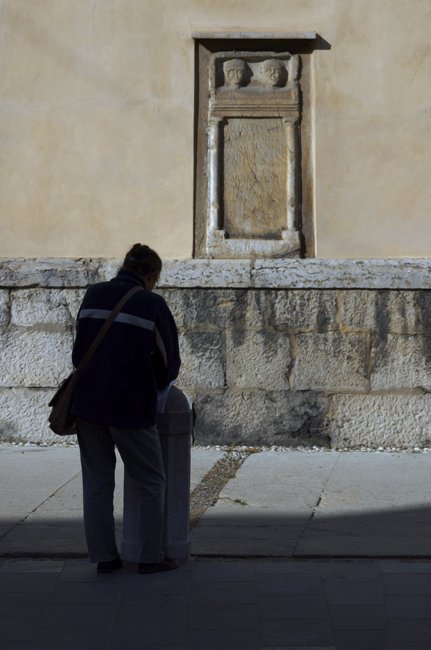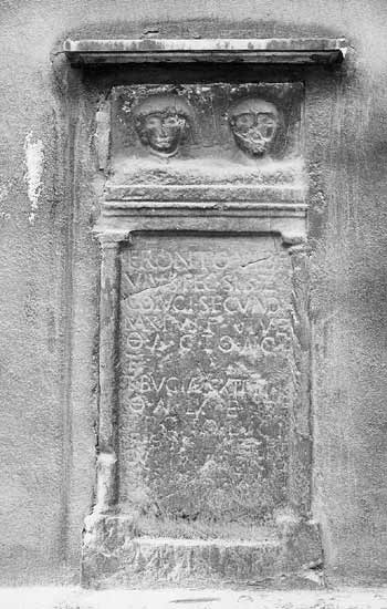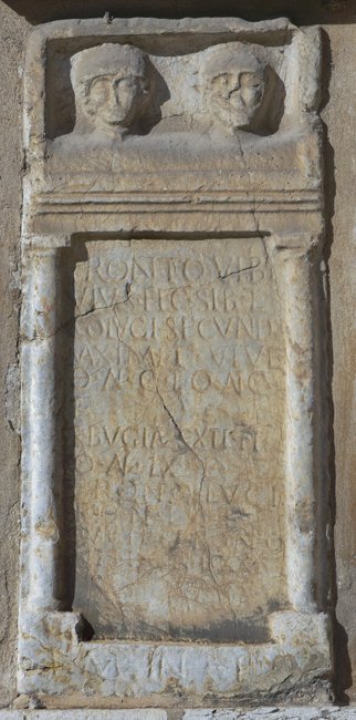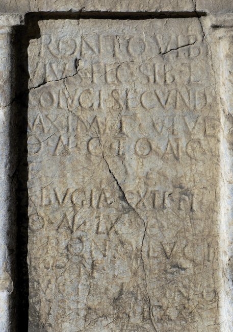- Fronto Vib(i) f(ilius) / vi(v)us fec(it) sibi et / co(n)iugi Secund(ae) / Maximi f(iliae) viv(a)e / o(bitae) an(norum) C et o(bitus) an(norum) C et / Bugiae Sexti fi(liae) / o(bitae) an(norum) LX et / Fronto Luci(i) / f(ilius) o(bitus) an(norum) LX et / Lucius Fronto/nis f(ilius) o(bitus) an(norum) LXX / l(ocus) m(onumenti) in f(ronte) p(edes) XV