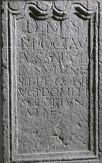 - D(is) M(anibus) s(acrum) / M(arcus) Octav/ius Satul/lus vi(v)us f(ecit) / sibi et coni/ugi Domiti/ae Fortun/atae