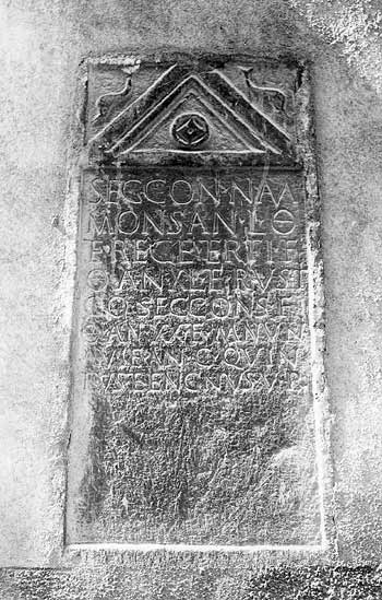 - Secconi Nam/monis (filio) an(orum) L o(bito) / et Reg(a)e Terti(i) f(iliae) / o(bitae) an(norum) XL et Rusti/co Secconis f(ilio) / o(bito) an(norum) XX et Manuni / avi(a)e an(norum) C Quin/tus et Enignus v(ivi) p(osuerunt)