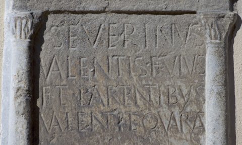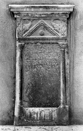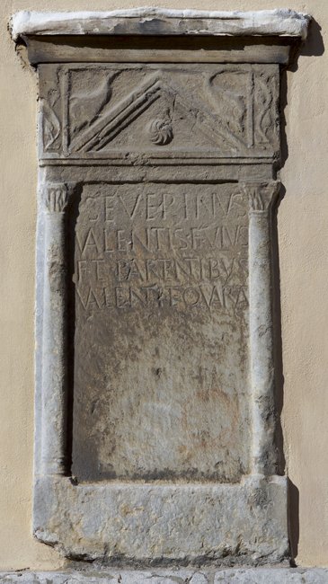 - Severinus / Valentis f(ilius) vi(v)us / f(ecit) et parentibus / Valenti et Quarta(e)