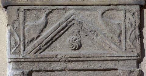 Eingeschriebener Giebel mit Rosette, auf den Schrägen Delphine und außen schmale Felder mit Ranke.