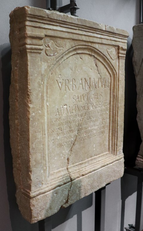 - Urbana Iuli(i) / Salvi (serva) h(ic) s(ita) / Atimetus conserv(us) fecit / coniuge direpta meo direptaq(ue) natis / ei mihi fatales cur rapuere dei / nam ter denos egi natales dum vita remansit / nunc tumulus cineres ossaq(ue) lecta tegit / vade age nunc hospes qua te via ducit euntem / huc omnis fatis turba relicta ruit