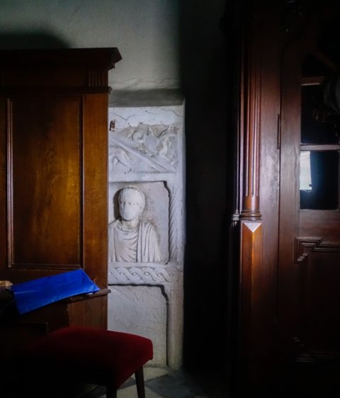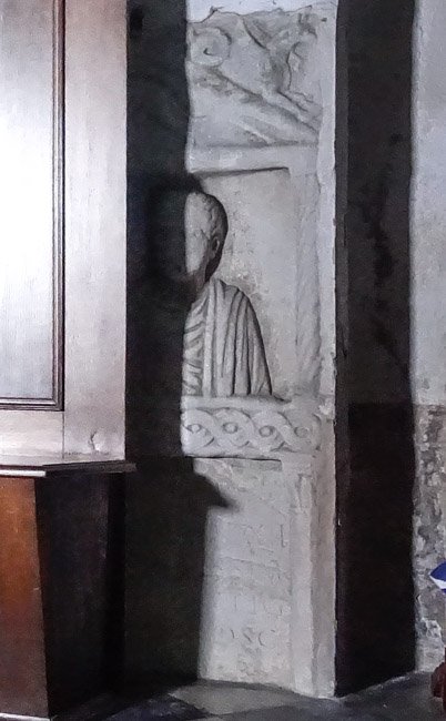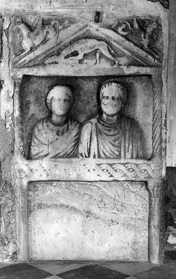 Im Hauptbild zwei Brustbilder (Ehepaar) zwischen Säulen mit Spiralkanneluren. Links Frau in Tunica und Mantel. Rechts Mann: bärtig, Sagum, Scheibenfibel.