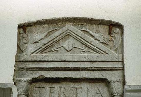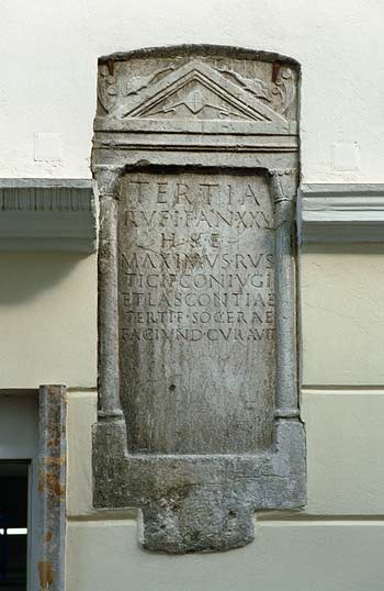 - Tertia / Rufi f(ilia) an(norum) XXV / h(ic) s(ita) e(st) / Maximus Rus/tici f(ilius) coniugi / et Lascontiae / Terti(i) f(iliae) socerae / faciund(um) curavit