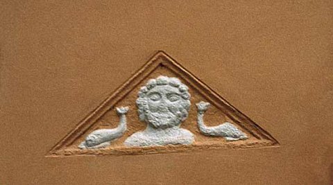 - Giebel: Büste eines bärtigen Mannes mit langen Locken (mythische Figur: Neptun ?) zwischen Delphinen.