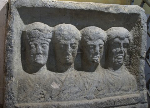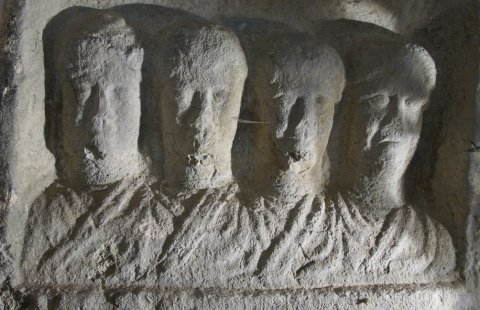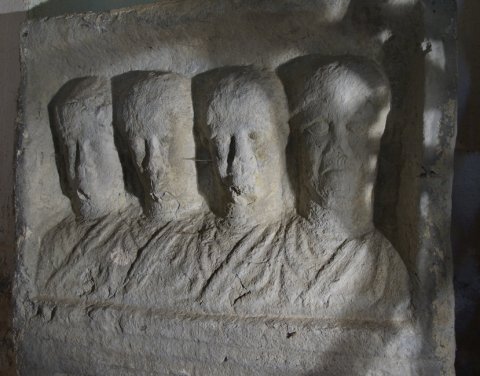 - In Rechtecknische vier Brustbilder einer Familie. Links Frau mit Haube, rechts Mann: bärtig, Sagum. In der Mitte zwei Jünglinge ? Schriftfeld zwischen Säulen.