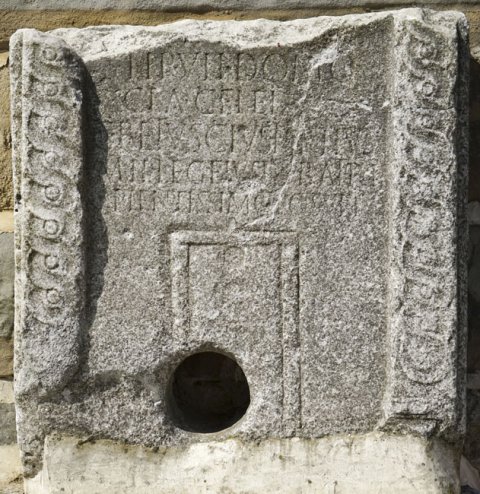 Unterhalb der Inschrift gerahmtes Bildfeld mit Waffen: Feldzeichen (signum) ? - Inschrift