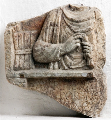- Brustbild eines Mannes: Ärmeltunica, Sagum, in der Linken Rolle (volumen), links Rollenbündel.