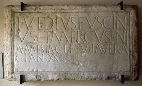 - T(itus) Vedius Fuscin/us et Mercuseni/a Mesia C(ai) l(iberta) f(ecerunt) Iulia Vera / C(ai) f(ilia) an(norum) XX