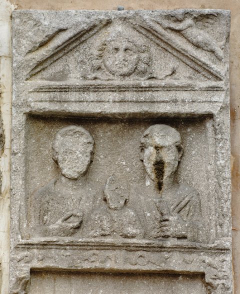 Im Hauptbild Familie: zwischen geschuppten Säulen Brustbilder eines Ehepaares mit Kind. Links Frau: Tunica, Mantel, Fingerring. Rechts Mann: Toga, in der Linken Rolle (volumen). Vorn Mädchen: in der Rechten Apfel, in der Linken Vogel.