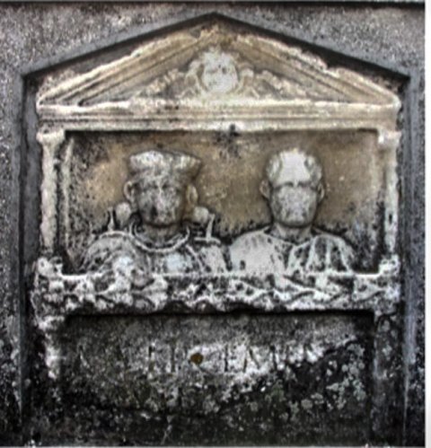 Im Hauptbild zwei Büsten (Ehepaar) zwischen Säulen. Links einheimische Frau: Haube, Ohrgehänge, Fibeln, Torques. Rechts Mann: bärtig, Tunica.