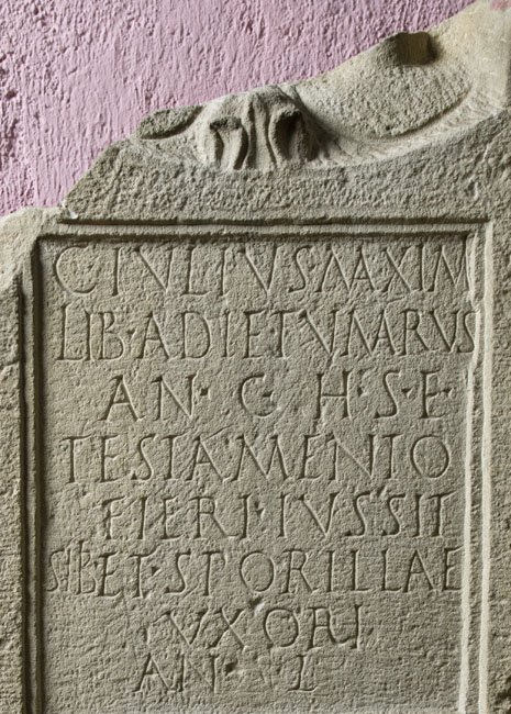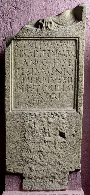 - C(aius) Iulius Maximi / lib(ertus) Adietumarus / an(norum) C h(ic) s(itus) est) / testamento / fieri iussit / sibi et Sporillae / uxori / an(norum) L