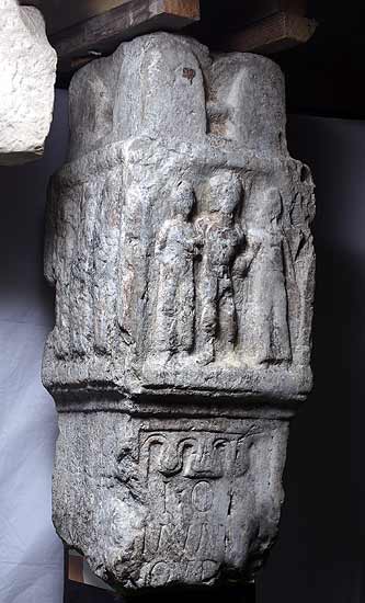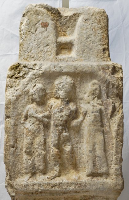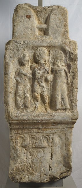 - Mythische Figur (Götter): Über dem Altarschaft Block mit gerahmten Reliefs auf drei Seiten. Auf der Vorderseite stehende nackte männliche Figur mit Szepter (Jupiter) zwischen zwei bekleideten Frauenfiguren (Juno, Minerva). Auf der linken Nebenseite drei langegewandete weibliche Figuren (Matres ?), darunter auf dem Altarschaft Blitzbündel. Auf der Rückseite drei stehende Figuren, links Luna mit Mondsichel auf dem Kopf, in der Mitte stehender nackter Mann (Apollo ?), rechts Sol mit Strahlenkranz und Viergespann.