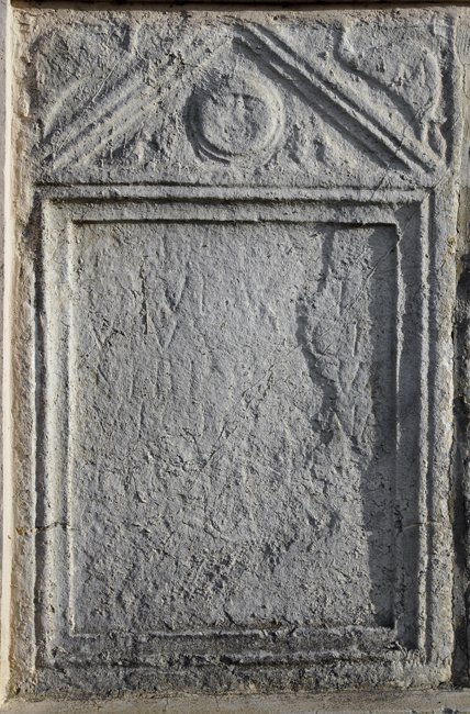- Eingeschriebener Giebel, auf den Schrägen Delphine, im Giebelfeld Gorgoneion zwischen Vögeln mit Trauben.