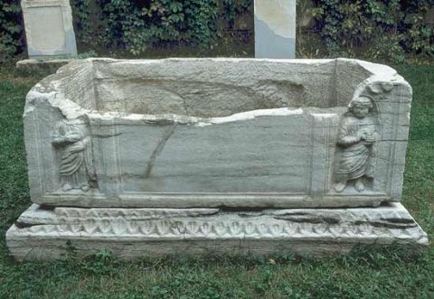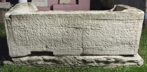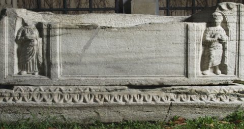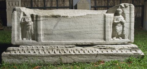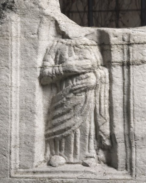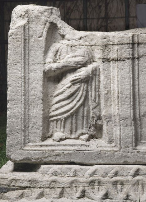 Auf der Vorderseite Schriftfeld zwischen Bogennischen mit Ganzfiguren (Ehepaar). Links Frau: Tunica, Mantel, Halsband mit Bulla. Rechts Mann: lange Tunica, Toga, in der Linken Rolle (volumen). Profiliertes und verziertes Sockelgesims.