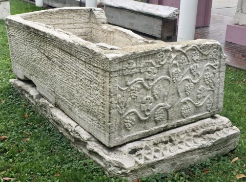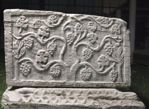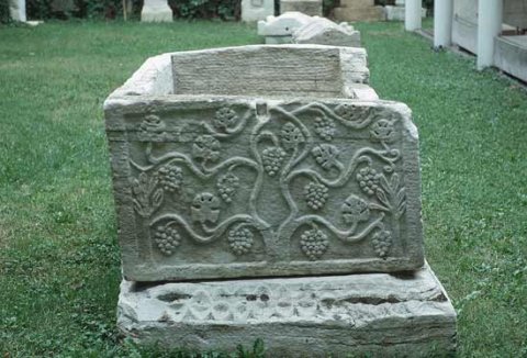 Auf der linken Schmalseite Weinranken zwischen zwei Bäumchen. Auf der rechten Schmalseite Gefäß mit Früchten und Weinranken zwischen sitzenden Panthern, hinter ihnen je ein Baum.