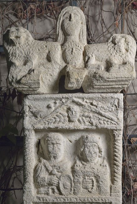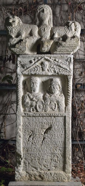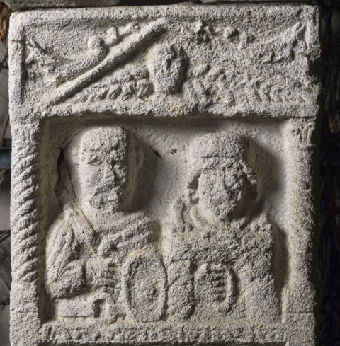 Im Hauptbild zwei Brustbilder (Ehepaar) zwischen Säulen mit Spiralkanneluren. Links Mann (Soldat): bärtig, Gürtel mit Ringschnalle. Waffen: Schwert, kleiner Schild. Rechts einheimische Frau: Haube, Torques, in den Händen Vogel. - Inschrift