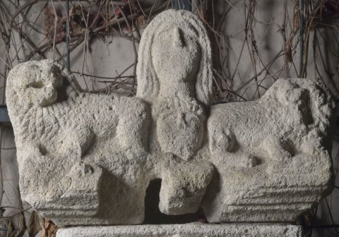 Eingeschriebener Giebel mit Gorgoneion zwischen Blättern, auf den Schrägen Meerwesen (Hippokamp).