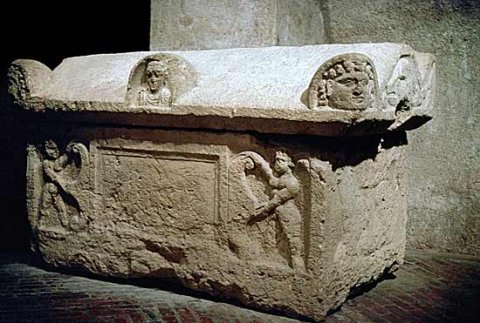 Dachförmiger Deckel, Eckakrotere mit Gorgoneia, in der Mitte der Vorderseite Bogennische mit Büste eines Mannes mit Sagum und Zwiebelknopffibel. In den Giebelfeldern Delphine.