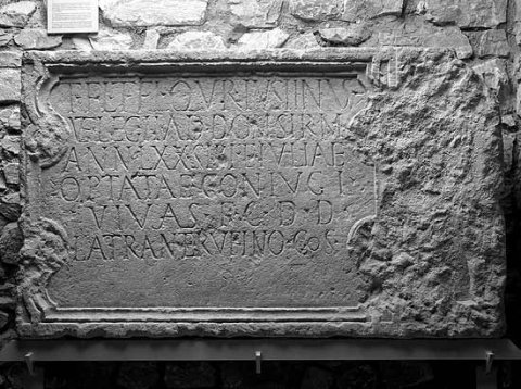 - T(itus) Fl(avius) T(iti) fil(ius) Qu(i)r(ina) Iustinus / vet(eranus) leg(ionis) II Ad(iutricis) dom(o) Sirm(io) / ann(orum) LXX sibi et Iuliae / Optatae coniugi / vivae{s} f(aciendum) c(uravit) d(e)d(icata?) / Lateran(o) et Rufino co(n)s(ulibus)
