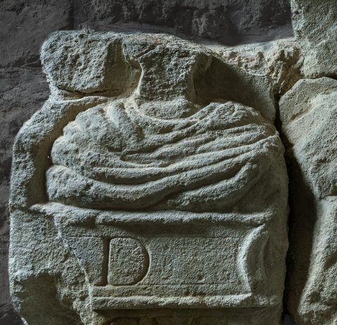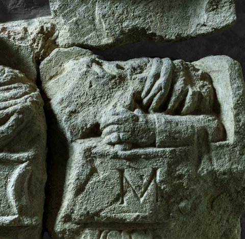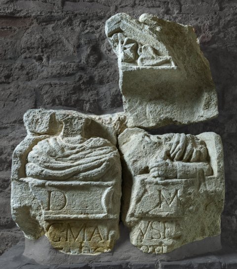 - Giebel eingeschrieben, Rosette zwischen Blättern, über den Schrägen Löwen. Im Hauptbild zwei Brustbilder (Ehepaar, links Frau mit Mantel um beide Schultern, rechts Mann in Ärmeltunica, in der Linken Rolle (volumen).