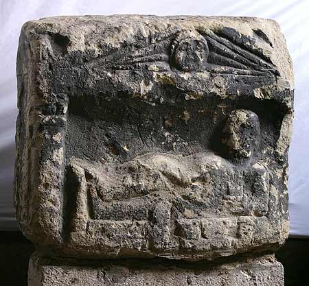 Im Hauptbild Totenmahl: zwischen Säulen auf Kline liegender Mann mit Becher in der Linken, davor Tisch mit Gefäßen, rechts und links Diener.